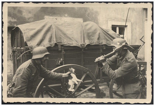 Лапы скручены верёвкой, ржут довольные фашисты: «Не такой уж ты и ловкий партизанский кот пушистый. Признавайся лучше сразу, сдай нам явку и радиста, Большевицкая зараза, партизанский кот пушистый»