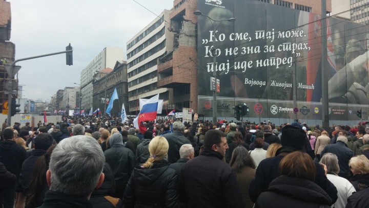 По неофициальным данным, в акции приняли участие до двух тысяч человек. Сторонники патриотических партий и движений держали в руках сербские и российские флаги и лозунги в поддержку России и против НАТО. Многие выражали негодование по поводу авиаудара ВВС США в ливийском городе Сабрата в пятницу, в результате которого погибли двое ранее похищенных сотрудников сербского посольства.