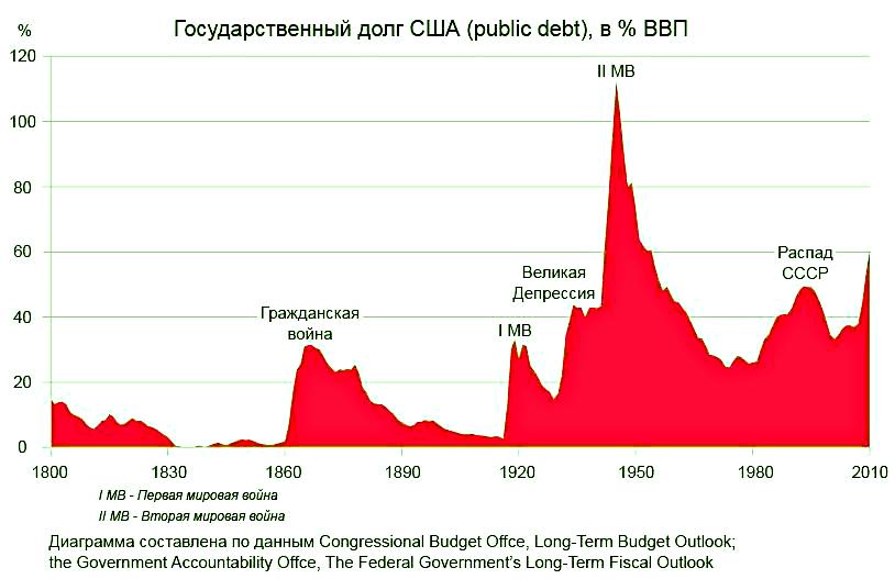 Но в этот естественный ход развития нашей страны, кто-то явно и преднамеренно вмешался. И сделал это не единожды. Назвать конкретных заказчиков атак на наше государство поименно, затруднительно, однако совершенно точно, можно обозначить как минимум одного выгодопреобретателя. Обратите внимание на график государственного долга США, в особенности на его пиковые значения, и то, как удачно в эти моменты на нашей планете всякий раз начинались войны и революции.