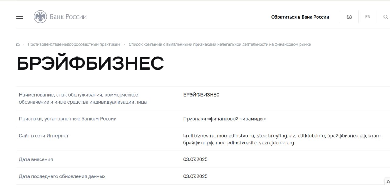 03.07.2025 года Банк России в деятельности Брэйфбизнеса неожиданно “нашёл” признак “финансовой пирамиды”, в связи с чем сведения о Брэйфбизнесе были включены в Список (https://elitklub.su/img/cbr.jpg), а в отношении некоторых сайтов (breifbiznes.ru, moo-edinstvo.ru, step-breyfing.biz, elitklub.info, брэйфбизнес.рф, стэп-брэйфинг.рф, moo-edinstvo.site, vozrojdenie.org) были инициированы меры, направленные на ограничение доступа на территории Российской Федерации.