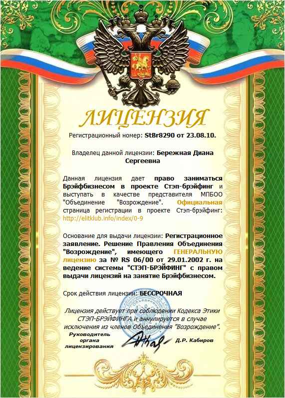 Лицензия на занятие Брэйфбизнесом в проекте Стэп-брэйфинг.