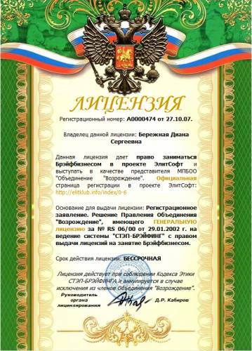 Лицензия на занятие Брэйфбизнесом в проекте ЭлитСофт.